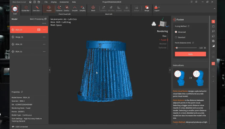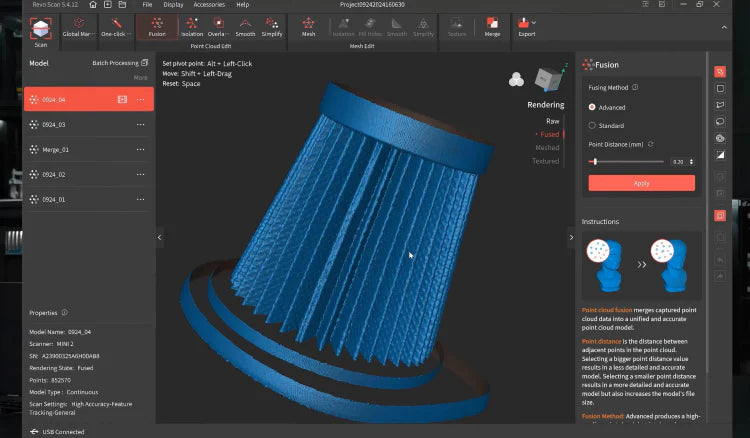 調整裝置後,再進行一次快速掃描,大約採集 300 幀,完成兩圈旋轉,並融合點雲。對比資料集可以發現,大面積的間隙明顯減少,尤其是在狹窄的縫隙處,3D模型變得更加完整。