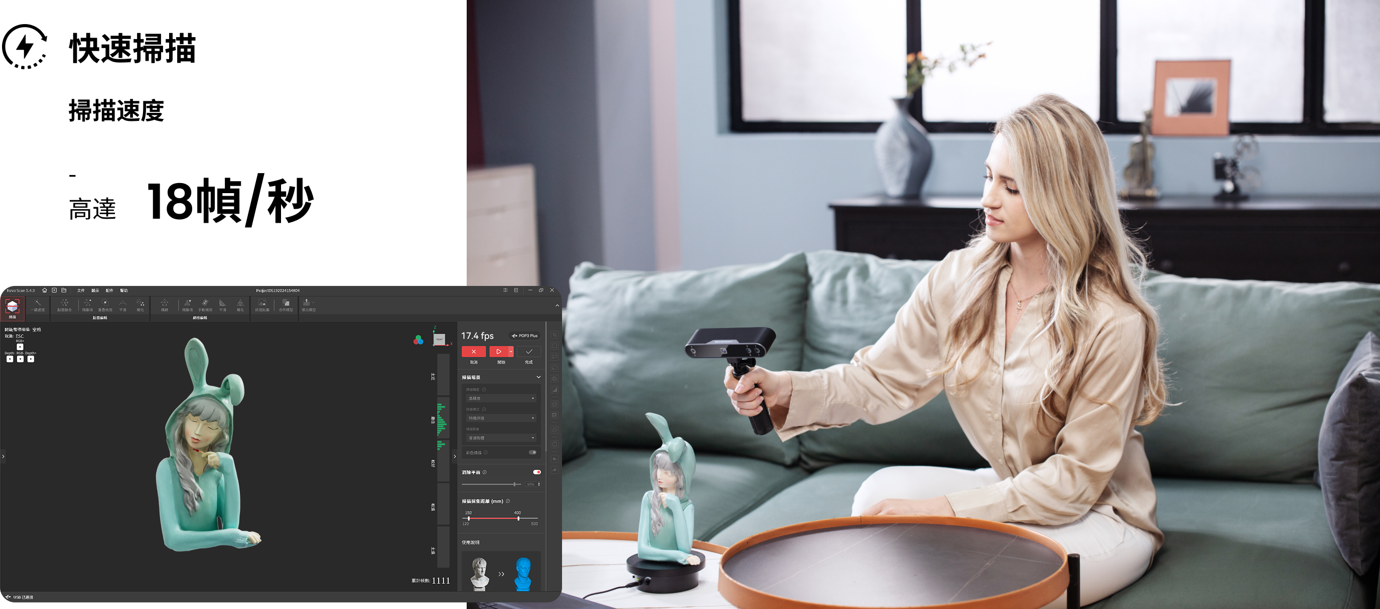 使用POP 3 Plus的高畫質RGB攝像頭、先進的畫素對映和閃光LED照明系統,只需一次彩色掃描即可建立栩栩如生的彩色3D模型。