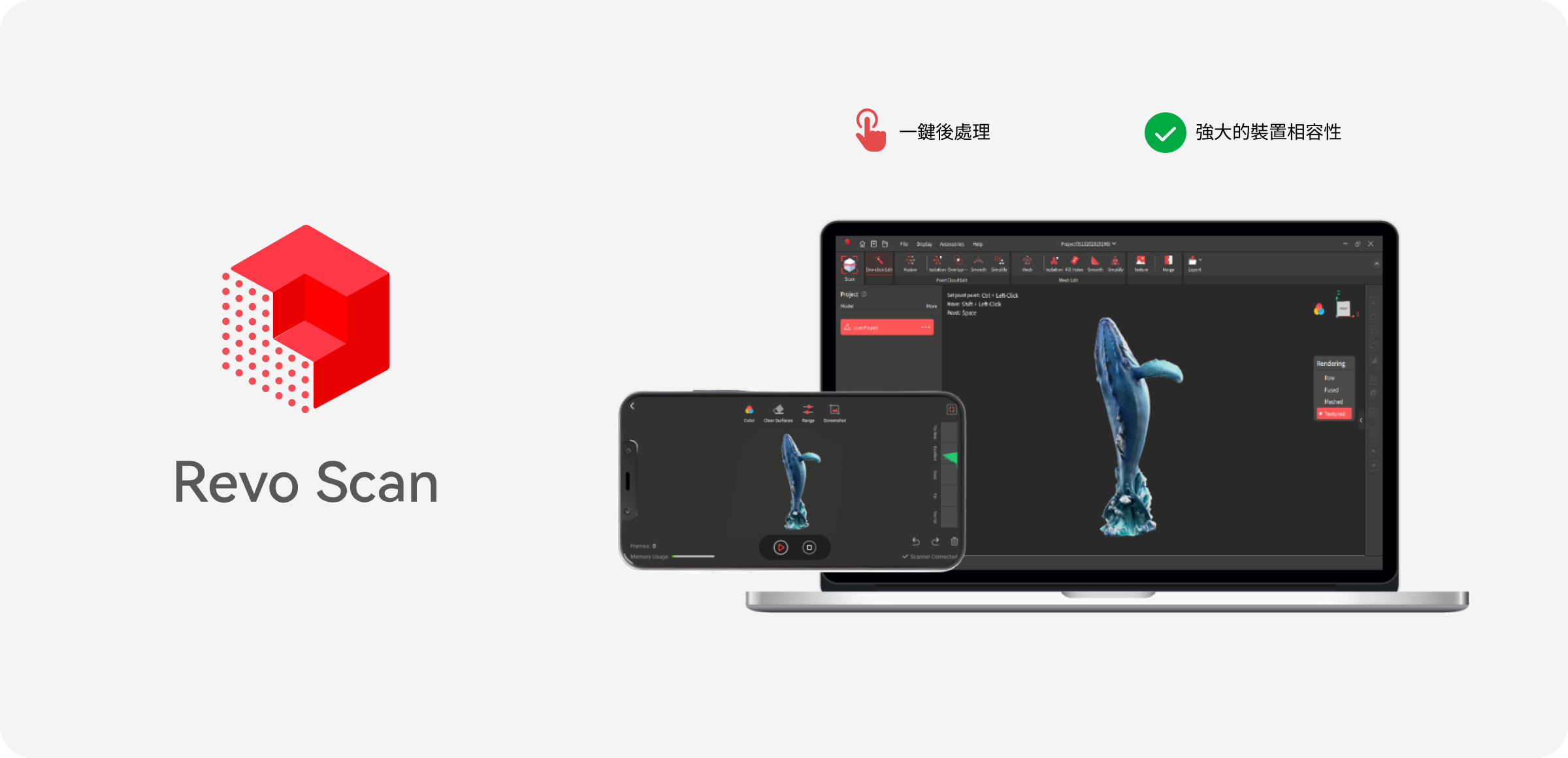 使用免費的Revo Scan軟體直觀地控制掃描並編輯資料。它相容iOS、Android、Windows和macOS裝置,並支援STL、PLY、OBJ、ASC、3MF、GLTF和FBX檔案格式,可與大多數CAD、3D建模和切片軟體無縫工作流程。