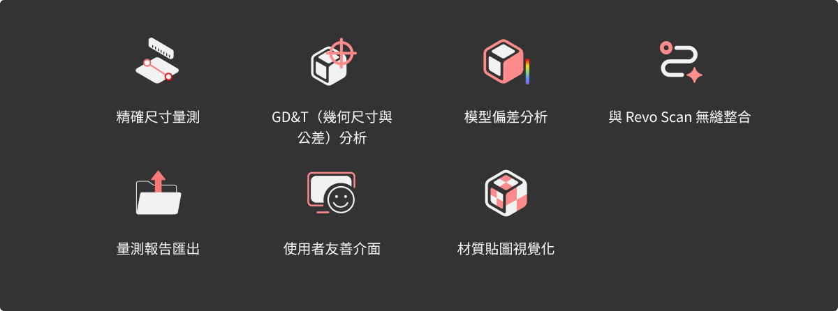 Revopoint Measure 是專業的 3D 計量軟體,透過比較點雲或網格資料與 CAD 模型或工程圖,來評估形狀、尺寸和品質。