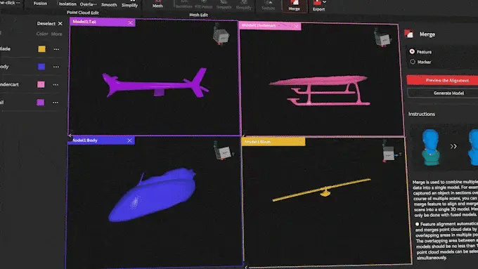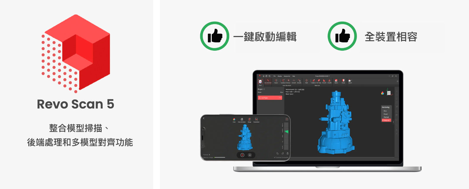 直覺友善的UI介面讓掃描後編輯操作輕鬆無負擔。支援 STL、PLY、 OBJ、ASC、3MF、GLTF、FBX 多檔案輸出,可隨時隨地編輯、融合、網格劃分等建模優化。