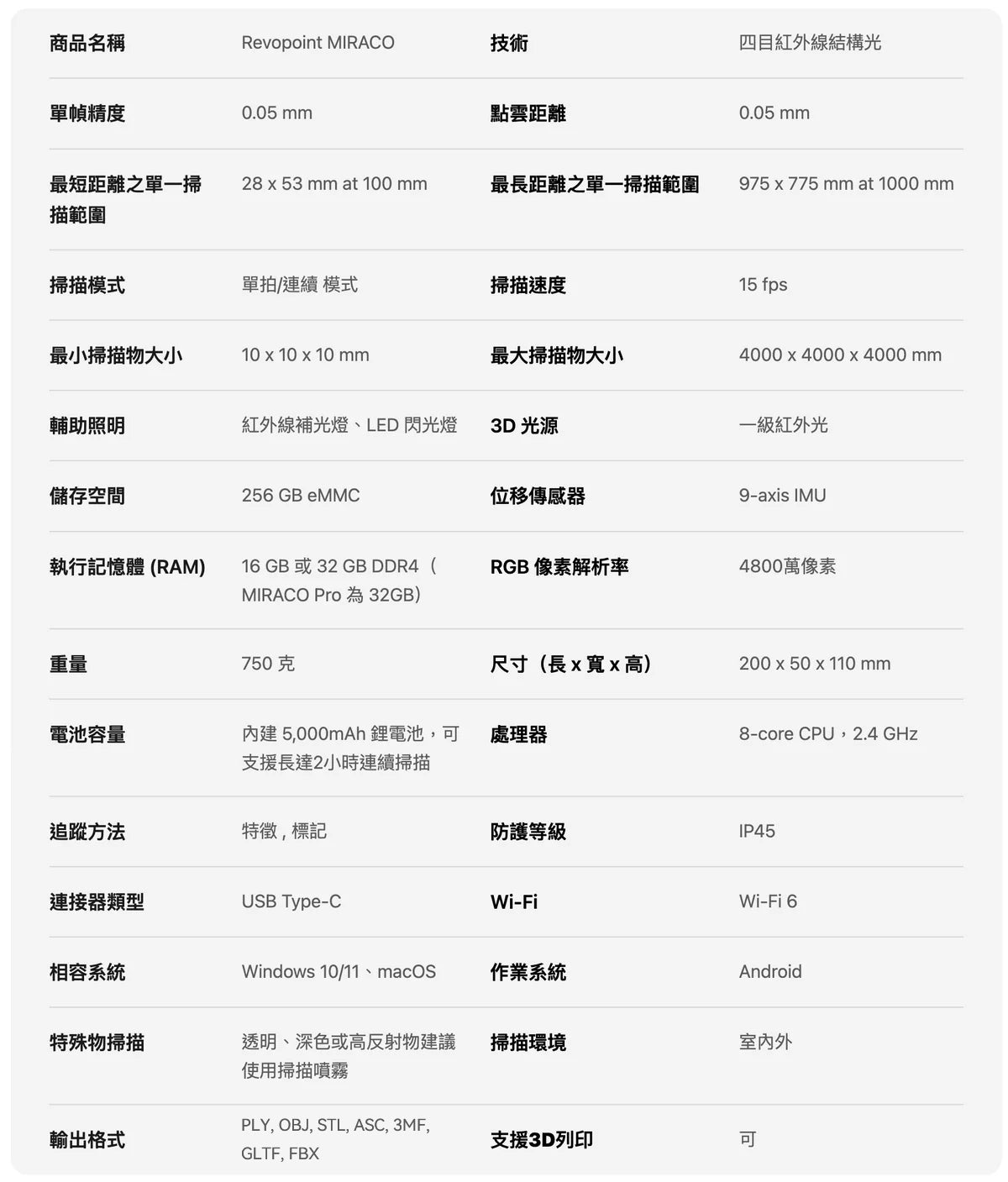 其卓越的大小多尺寸掃描表現歸功於此次配備的四顆鏡頭設計。精度體現依舊優秀不減,單幀精度更是高達 0.02 mm。